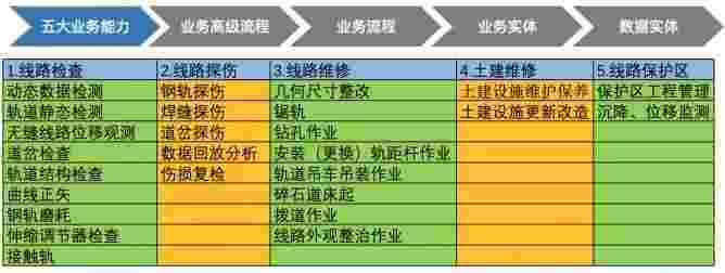 在轨道运维业务中,,,,,,,,,,我们形成了完整的从业务能力(业务域)-业务流程-业务实体-数据模型的分析梳理过程。。。。。。。。。。。轨道运维业务能力如下图所示:::::
