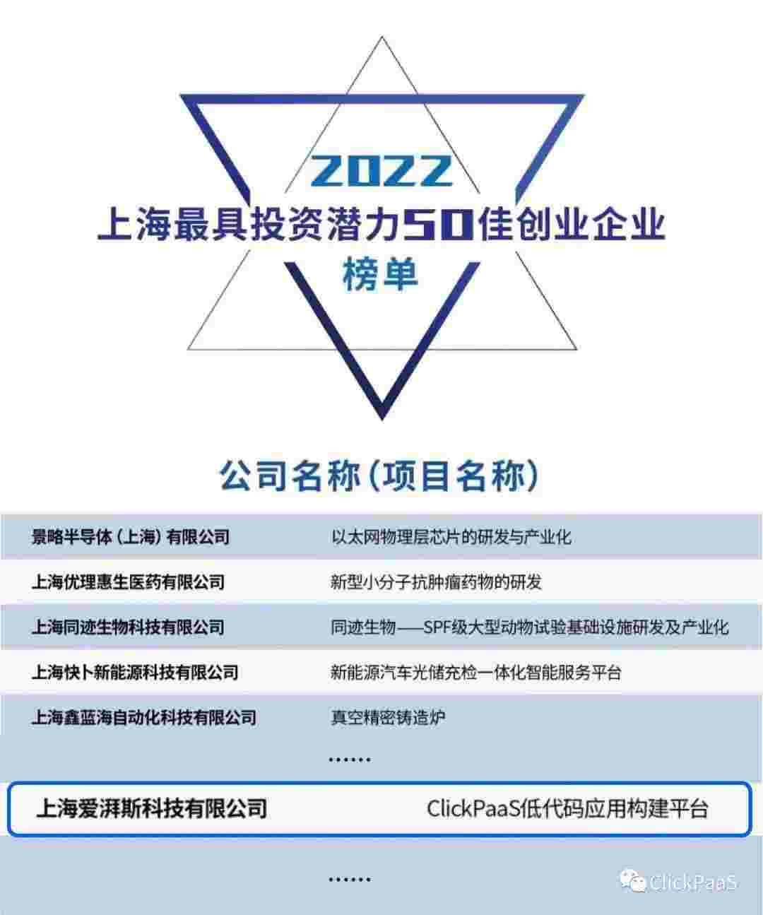 小米钱包 作为国内低代码PaaS平台的领军企业,,,,,,,,,,,与120家创企入围角逐。。。。。。期间接受了来自德同资本、、、、、、、、、、、领中资本等知名投资机构的10位投资人组成专家评委团的背靠背盲选。。。。。。并最终入围“2022上海最具投资潜力50佳创业企业”榜单,,,,,,被列入“上海市重点培育创业企业库”。。。。。。。