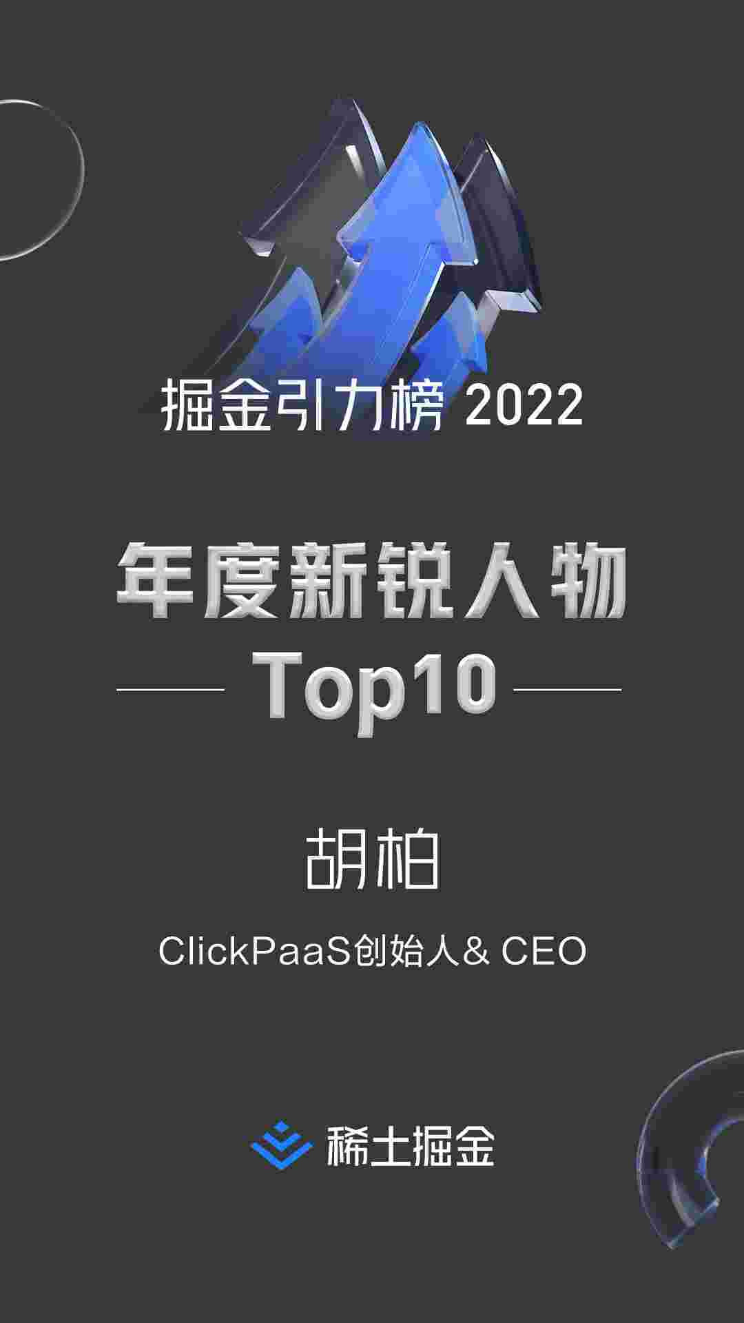 2022年1月6日,,,,,,,,,,,,稀土掘金社区第一届「掘金未来大会」成功举办,,,,,,,,,,会上发布了“2022 稀土掘金引力榜 年度新锐人物”榜单,,,,上海爱湃斯科技有限公司(简称小米钱包)创始人及CEO胡柏实力入选年度新锐人物TOP 10。。。。。。。。